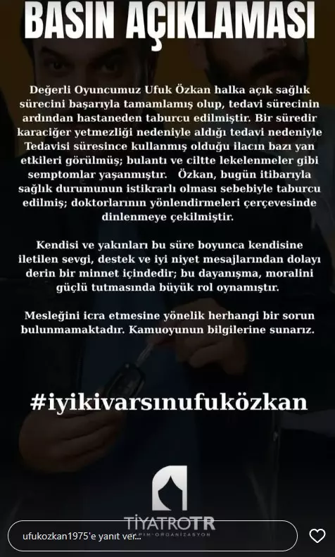 “Değerli oyuncumuz Ufuk Özkan, halka açık sağlık sürecini başarıyla tamamlamış olup hastaneden taburcu edilmiştir. Bir süredir karaciğer yetmezliği nedeniyle aldığı tedavi süresince kullandığı ilaçların yan etkileri sebebiyle bulantı ve ciltte lekelenmeler yaşamıştır. Bugün itibarıyla sağlık durumu istikrarlı olduğundan taburcu edilmiş ve dinlenmeye çekilmiştir. Mesleğini icra etmesine yönelik herhangi bir sorun bulunmamaktadır.”